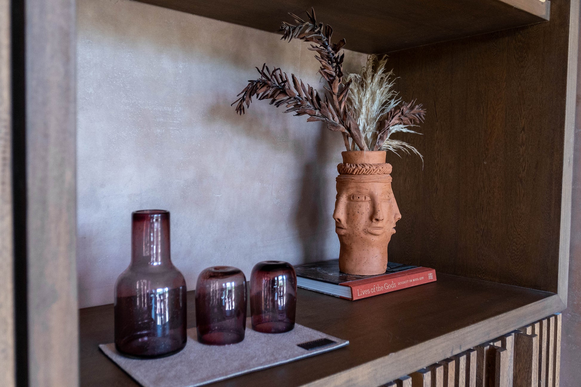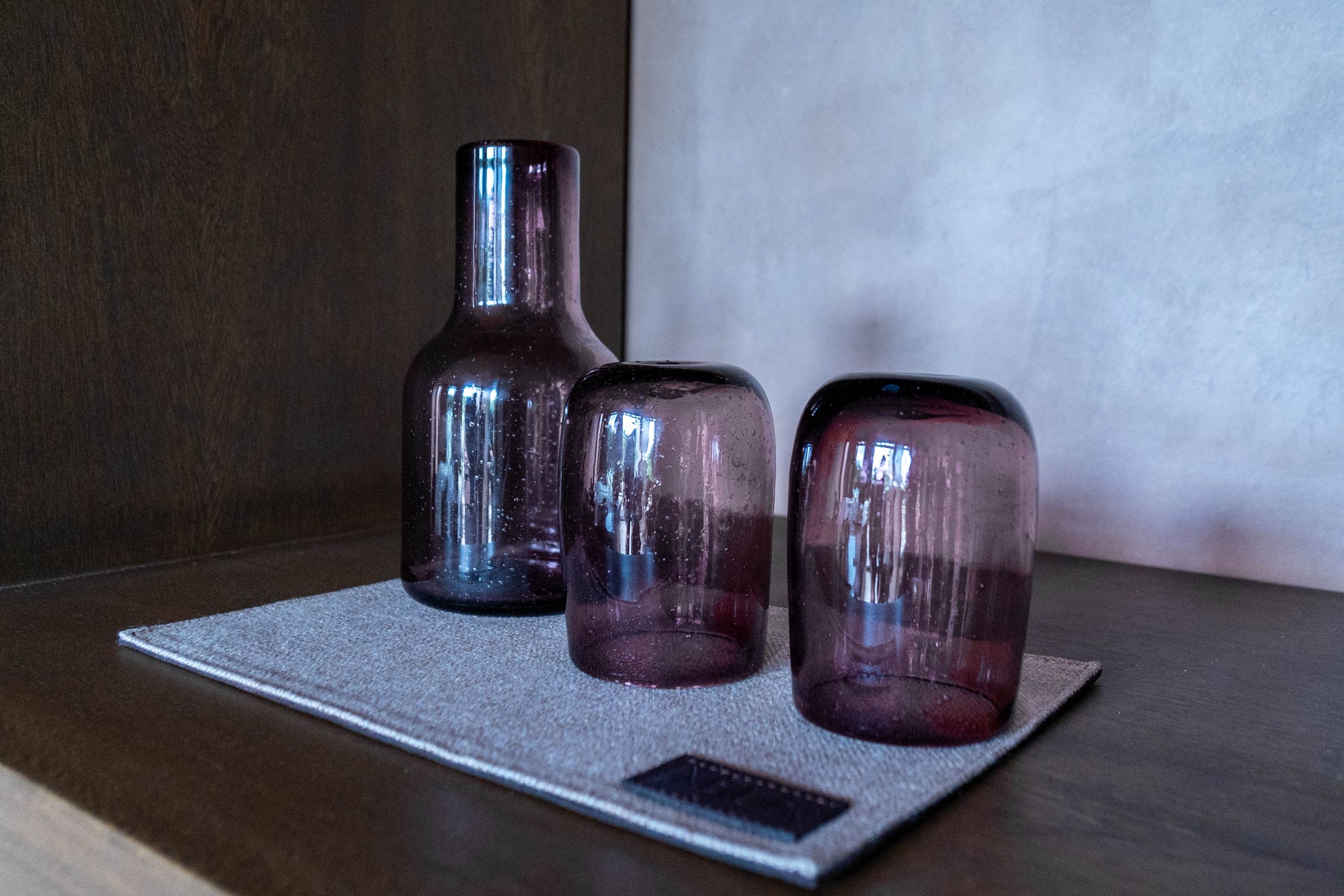 Add a touch of elegance and practicality to your space with this beautifully handmade glass blown bottle and glasses set in a sophisticated smoked pink hue. Perfect for keeping water nearby, the set includes a 750 ml bottle with a sleek wooden lid, and two matching glasses. Whether placed by your bed, in your living room, or on a desk, this set brings both functionality and style to your home. Each piece is crafted by skilled artisans, blending artisanal beauty with everyday convenience.